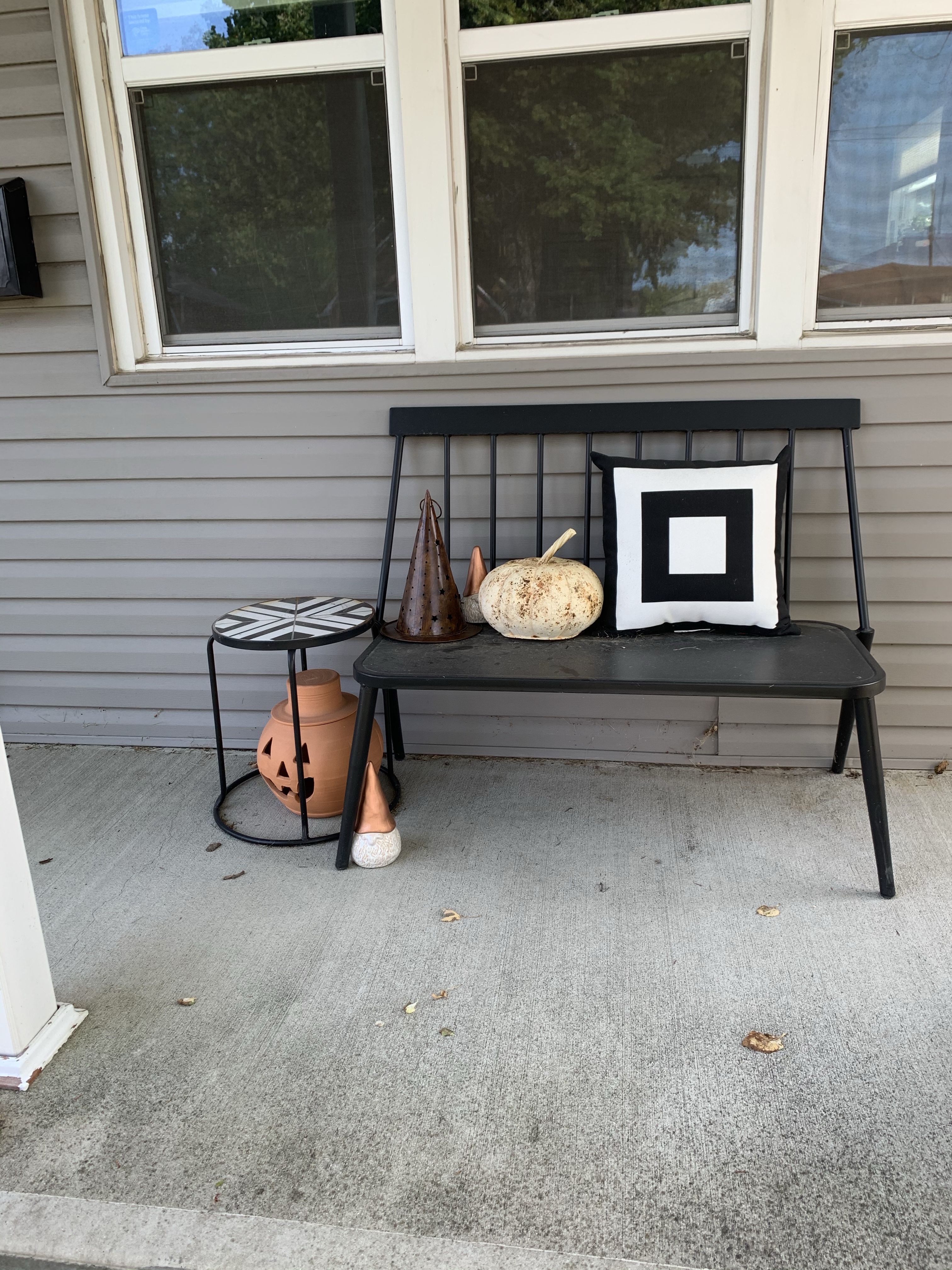 Starting with the front porch, I get pumpkins from the local nursery and add them to the bench that is out on my front porch all year round like the photos below. This year when I went to look for those pumpkins none of them were really what I was looking for so I started to think about other options.