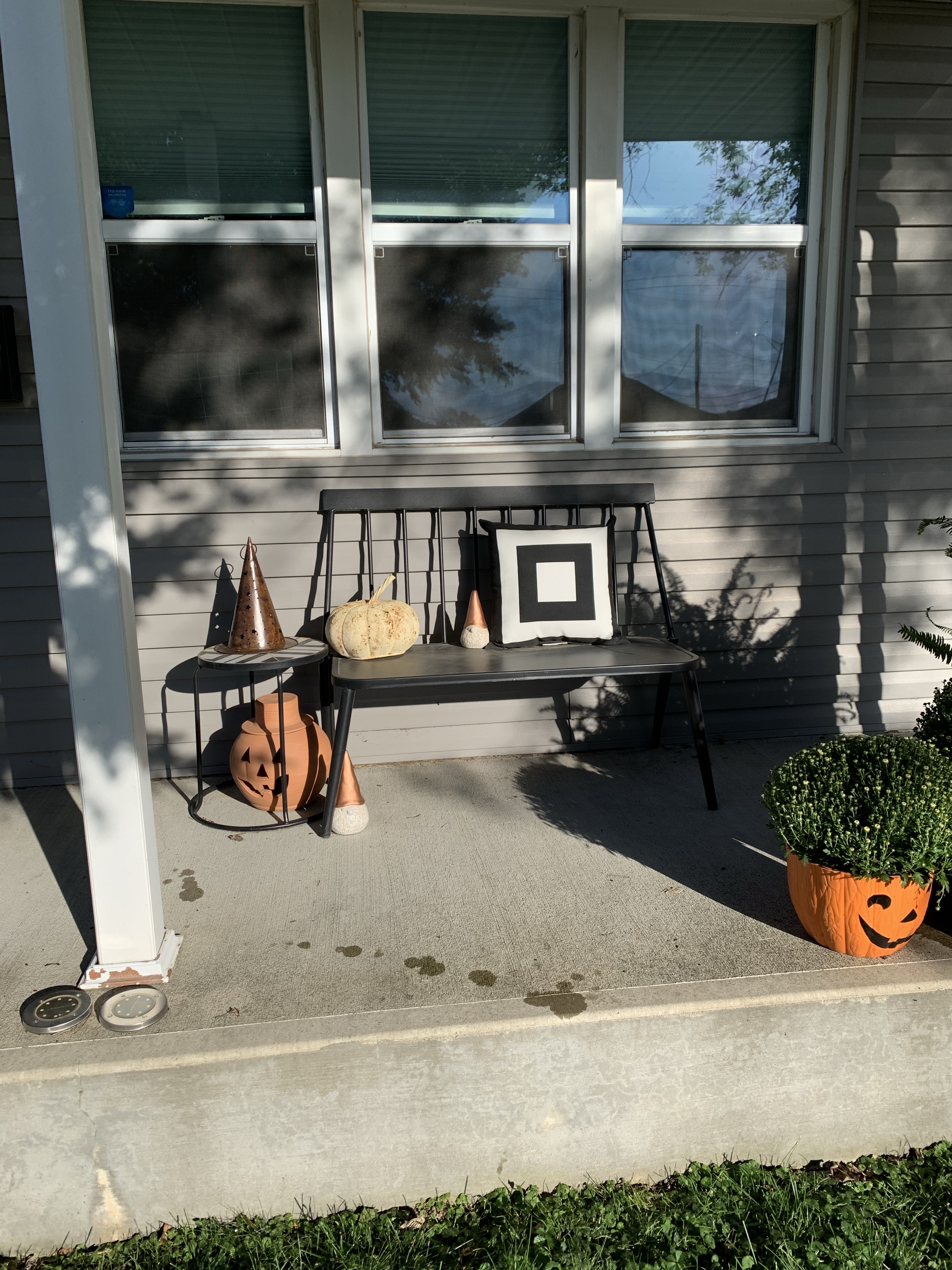 The front porch is always a work in progress for me but especially in the fall. Since the pumpkins were a bust I wanted to play up a look I was going for awhile with the fall porch. I really wanted to play with the rust color that I have from a terra cotta jack-o-latreen that I was given by my mother. So when I was out shopping I came across this clear and rust pumpkin and an idea was born. I also liked that they would still work with the garden gnomes I had found at Target this summer.