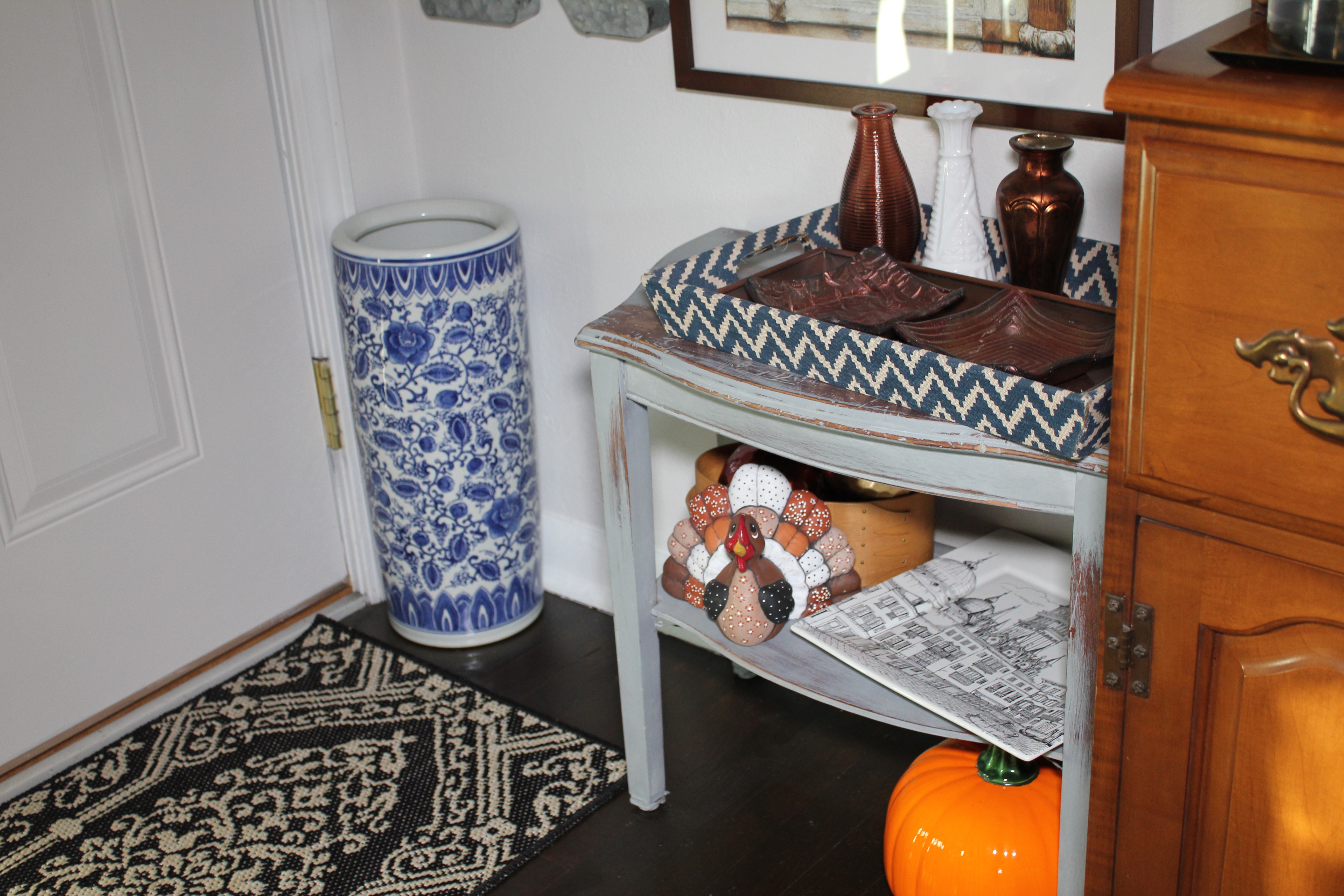 When I start thinking about fall decorations there are a few things that always come to mind, rust and golds, leaves and pumpkins. The more pumpkins the better in my opinion. I also trade out decorations based on the month, like for October I go crazy with the jack-o-lanterns, then in November I switch out for the turkeys.